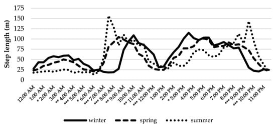 Daily activity patterns were not constant during the experimental period. Significant differences in the average length of trajectory segments at various timestamps were observed among seasons, as shown in Figure 6. The morning grazing period was longer and occurred earlier during summer, while the second grazing period was shorter and delayed until 9–10 p.m. In contrast, animals showed less activity at sunrise and longer grazing periods in the afternoon during winter. This adaptative behavior possibly responded to higher temperatures in summer and daylight, which increased approximately 3 h between the beginning and end of the experimental period.