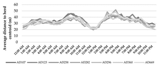 Regarding herd behavior, our results coincide with [58,59], who showed that the distance of individuals to herd centroid was affected by the time of the year. We also observed that this distance depended on the type of activity carried out by animals, with a maximum average distance during grazing.