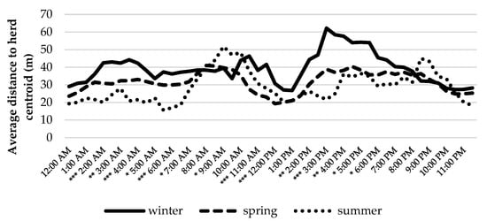 Seasonal variability of herd behavior. Asterisks indicate statistical significance: * = p < 0.05; ** = p < 0.01; *** = p < 0.001.