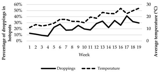 Weekly percentage of droppings in the two main hotspots for dung deposition according to ambient temperature.