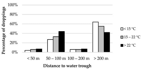 The temporal domain was also important to describe the distribution of animals and dung. Large variability existed both intraday and between days. In this study, the interactions among ambient temperature, distance to water and canopy cover explained the dynamics of animal distribution and their relationship with feces deposition. Contrary to what was observed in previous studies [27,53], relative humidity did not significantly influence dung dispersal in our trial, probably because of its limited range when aggregated weekly.