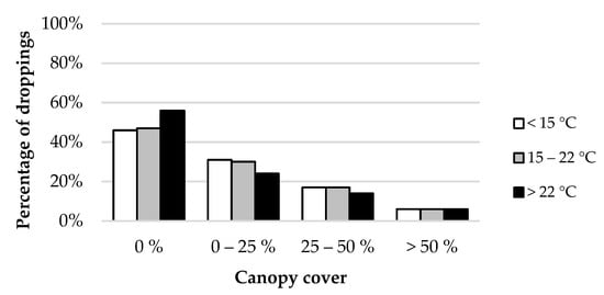 An interaction between ambient temperature and canopy cover was also observed for the distribution of dung (Figure 11). Although most droppings were deposited in areas without tree cover, this proportion was even larger on warm days. Cattle may spend more time under trees with higher temperatures, but it did not increase dung deposition in these areas. In contrast, the number of dung pats was reduced in plots with some canopy cover.