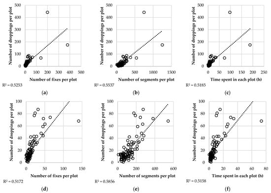 Figure 12 shows the relationship between the number of feces accumulated in each sampling plot during the experimental period and animal presence in those plots. The presence of animals was represented with three different indicators: number of location fixes, number of trajectory segments, and total time animals spent within the plot. As hotspots accumulated a large proportion of feces and location fixes, they could have a great leverage effect on the regression between feces counting and animal presence. To check that, Figure 12 includes the relationship between feces and animal presence calculated both including (Figure 12a–c) and excluding (Figure 12d–f) hotspot data.