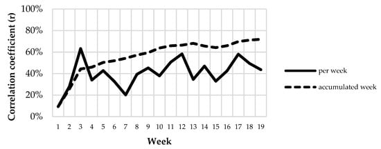Correlation coefficient between the number of droppings and the number of location fixes per plot, per week and per accumulated week.