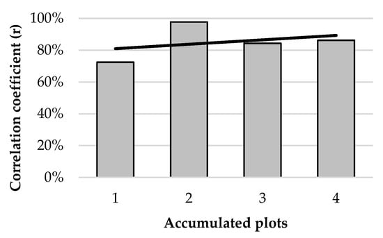 Correlation coefficient between the number of droppings and the number of location fixes per accumulated plot.