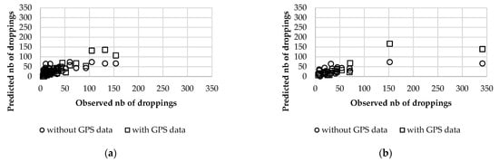 Relationship between observed and predicted number of droppings for the best model in Table 2 and for the equivalent model excluding GPS data. (a) Calibration data set. (b) Validation data set.