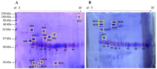 | Spot ID HC a | Spot ID DC a | Mr (kDa)/pI b | Normalized Quantity (×103) b | Protein Name c | Mr (kDa)/pI c | Score c | Sequence c |