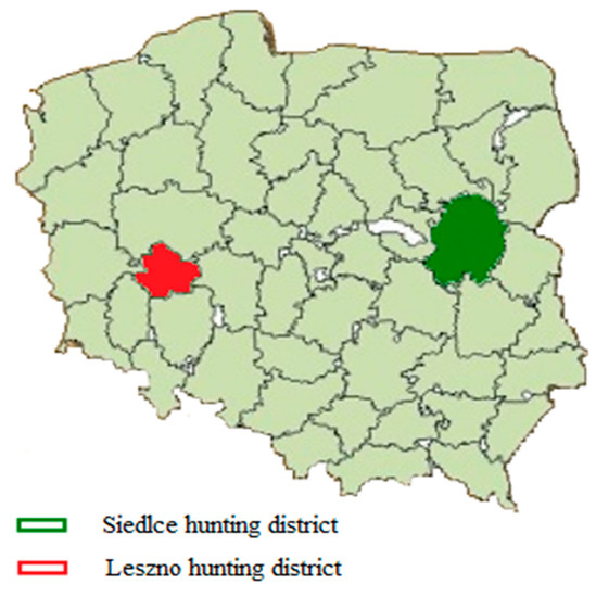 The study was carried out on material from mallard ducks reared in two study areas: the Siedlce hunting district, located in the Masovian Voivodeship, and the Leszno hunting district in the Greater Poland Voivodeship (Figure 1). In both the Voivodeships, cereals (wheat, barley, and maize) are dominant in the crop structure [18]. Therefore, it is likely that grains of cereals made up a large percentage of the mallards’ diet. The two regions were distinguished by different environmental resources and different degrees of intensification of agriculture. In the Greater Poland Voivodeship, there are many large farms with intensive crop production, including high levels of mineral fertilizers. Farms in the Masovian Voivodeship have a smaller area and are managed more sustainably, so their environmental impact is smaller [19].