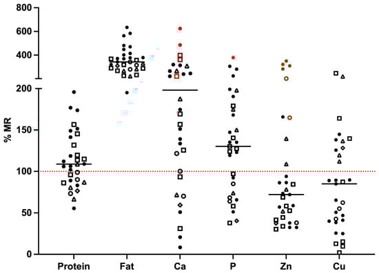 Selected nutrients measured in 31 RMBDs labelled as complete pet food [percent of FEDIAF minimum requirement] according to species and life stage. Full dot—adult dogs (n = 15); empty dot—growing dogs (n = 3); squared dot—dogs all life stages (n = 8); triangle—adult cats (n = 4); reverse squared dot—dogs and cats (adult + growth, n = 1). Black lines represent the medians. Red dot line represents 100% of FEDIAF minimum requirement according to species and life stage. For calcium and P content, red values exceed the maximum nutritional limit for growth or adult (light red) or both (dark red). For Zn content, brown values exceed the EU legal limit. MR: minimum requirement.