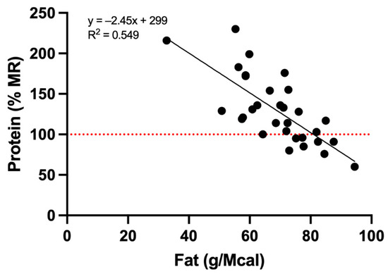 Significant negative correlations were found between content of fat (g/Mcal) and other nutrients (expressed as % MR): protein (r = −0.74, p < 0.0001; Figure 2), calcium (r = −0.36, p = 0.047), phosphorus (r = −0.51, p = 0.003), zinc (r = −0.68, p < 0.0001), copper (r = −0.37, p = 0.038).