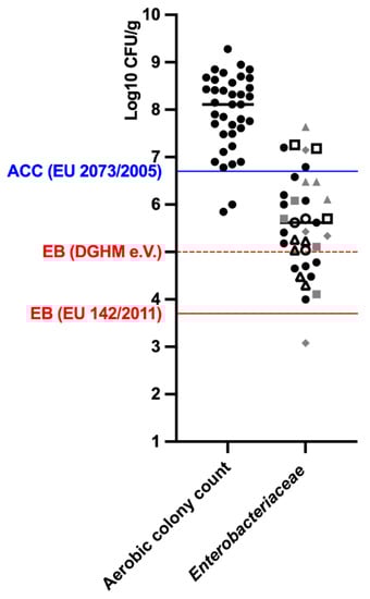 Microbial load (total aerobic bacteria and Enterobacteriaceae log10 CFU/g) of 37 RMBDs. The blue solid line represents the threshold for aerobic colony count in animal by-products (EC No 2073/2005); the red solid line represents the threshold for Enterobacteriaceae in raw pet food (EC No 142/2011); the red dashed line represents the threshold for Enterobacteriaceae in raw beef and poultry meat intended for human consumption (German Society for Hygiene and Microbiology—DGHM e.V.). In relation to Enterobacteriaceae, complementary RMBDs are marked in grey and complete RMBDs in black. Full dot—adult dog (n = 8); empty dot—puppy (n = 1) squared dot—adult and puppy (n = 3); triangle—adult cat (n = 4); reverse squared dot—dog and cat (adult + growth, n = 1). CFU, colony-forming units; ACC, Aerobic Colony Count; EB, Enterobacteriaceae.