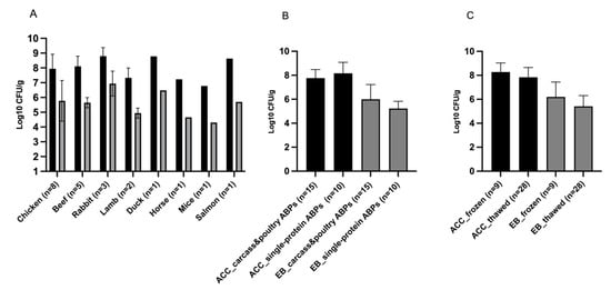 Figure 4 shows the bacterial load of single-protein ABP products grouped according to protein source (A), composition (B), and storage condition at arrival (frozen or partially thawed) (C). Poultry (chicken n = 8 and duck n = 1) and beef (n = 8) were the most represented single-animal protein sources, and the highest bacterial contamination was found in three RMBDs with rabbit ABPs (Figure 4A): a complete diet for adult dogs (meat and ABPs), a complete diet for dogs of all life stages (entire carcass), and complementary food for cats (entire carcass). In these products, mean ACC and enterobacterial counts were 9.8 × 108 and 2 × 107 CFU/g, respectively. ACC and enterobacterial counts have been grouped according to RMBD composition and storage condition at arrival in Figure 4B,C, respectively. RMBDs containing single-protein ABPs other than poultry or not containing whole carcasses (beef, horse and lamb) were higher in total ACC than RMBDs containing protein ABPs from poultry or entire carcasses from chicken, rabbit, duck, salmon, and mice (8.17 ± 0.91 vs. 7.76 ± 0.71 Log10 CFU/g), while the opposite was true for Enterobacteriaceae count (6.00 ± 1.23 vs. 5.23 ± 0.60 Log10 CFU/g). With regard to storage condition, frozen RMBDs had higher ACC and Enterobacteriaceae counts than products partially thawed at arrival (8.27 ± 0.76 vs. 7.83 ± 0.81 and 6.20 ± 1.24 vs. 5.41 ± 0.91 Log10 CFU/g, respectively).