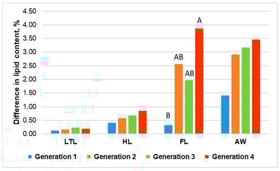 The difference between the two lines in all meat cuts increased from generation to generation, with a magnitude related to the absolute lipid content of the meat cut. Here, the differences in the lipid content from generations 1 to 4 in the four meat cuts are reported: 0.12-0.16-0.23-0.19% for the LTLs, 0.41-0.58-0.67-0.85% for the HLs, 0.32-2.56-1.97-3.86% for the FLs, and 1.41-2.91-3.16-3.47% for the AW. However, a significant effect was observed for the different lipid content in generations 1 and 4 of the FLs only, whereas 2 and 3 were intermediate (p < 0.001). In the other meat cuts, no significant differences were observed as a result of the relatively limited sample size and data variability.