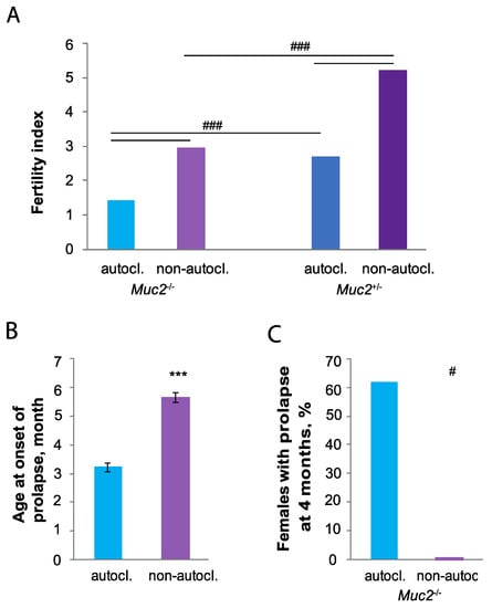 Effect of the autoclaved diet on the reproductive performance and age at onset of prolapse of Muc2+/− and Muc2−/− female mice. (A) Fertility index of female mice fed on the autoclaved (Muc2+/− n = 74, Muc2−/− n = 34) and non-autoclaved diets (Muc2+/− n = 21, Muc2−/− n = 10). (B) Age at onset of prolapse of Muc2−/− female mice fed on the autoclaved (n = 23) and non-autoclaved diets (n = 20). (C) Number of Muc2−/− female mice with prolapse at 4 months fed on the autoclaved and non-autoclaved diets. # p < 0.05, ### p < 0.001, Fisher’s exact test, *** p < 0.001 Mann–Whitney U-test.