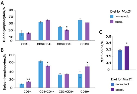 Percent of immune cells of Muc2−/− mice fed on the autoclaved and non-autoclaved diets. (A) The percent of immune cells in the blood of mice fed on the autoclaved (Muc2−/− n = 5) and non-autoclaved diets (Muc2−/− n = 4). (B) The percent of immune cells in the spleen of mice fed on the autoclaved (Muc2−/− n = 5) and non-autoclaved diets (Muc2−/− n = 5). (C) The methionine level in thigh muscle of mice (Muc2+/− on the autoclaved diet n = 5, Muc2+/− on the non-autoclaved diet n = 5). * p < 0.05, ** p < 0.01 Mann–Whitney U-test.