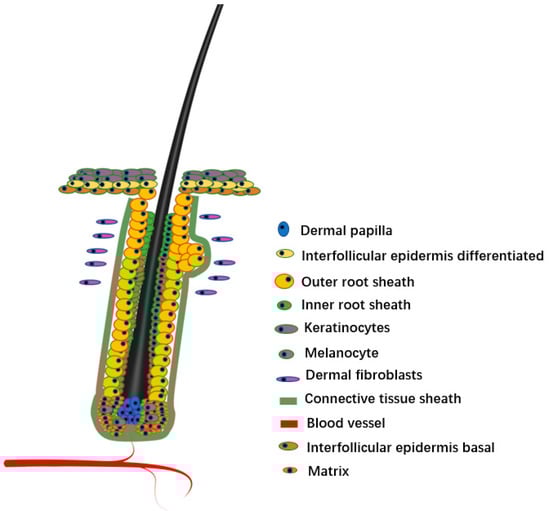 As a micro-organ embedded in animal skin tissue, the hair follicle plays a key role in the physiological processes of sensing external contact, maintaining body temperature, protecting internal tissues, and preventing foreign body invasion. As a derivative of skin, hair follicles directly affect hair growth, shedding, and regeneration. The hair follicle consists of epidermis and dermis. The epidermis of the mature hair follicle finally differentiates into three enclosed epithelial cylinders, the central most cylinder forms the shaft, the outermost cylinder forms the outer root sheath (ORS) that separates the whole structure from the dermis, and the middle cylinder forms an inner root sheath (IRS) to guide the shaft outward [1]. The hair follicle roots are located in the dermal layer of the skin, which provides important nutrients for the hair, and distributes numerous nerves, muscles, and micro-vessels. The bottom of the hair follicle is the nipple, where the hair grows.