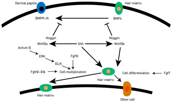The DP provides the guiding signals needed to activate epithelial progenitor cells and initiate hair follicle regeneration. The DP cells play an important role in all stages of hair follicle development and life and are regarded as the ‘command center’ of hair follicles. They determine the thickness, length, and morphogenesis of hair follicles by secreting signaling molecules, such as growth factors and cytokines, and may even determine the periodic cycle of the hair follicle. There are complex and orderly signaling molecules exchanges between hair matrix cells and DP cells, including Wnt, BMP, Shh, and other signaling pathways. These signaling pathways accurately regulate the development of hair follicles through mutual exchange and dialogue (Figure 2). Shh is essential for proliferation of epithelial cells and downgrowths of the regenerating follicle into the dermis [14]. When the Shh gene of mice was knocked out, the mice could normally form placode and dermal condensate, but the hair follicles could not continue to develop backward, resulting in developmental stagnation [15,16]. The activation of the Shh signaling pathway in the early stages of anagen resulted in the expression of Wnt10a and Wnt10b in DP and matrix cells, respectively. The activated Wnt pathway will promote the expression of STAT3, so that the matrix cells can proliferate rapidly. In the early stage of hair follicle formation, the BMP signaling pathway is a kind of inhibitory regulation to promote hair follicle morphogenesis, and it can also prevent the activation of the Wnt signaling pathway and maintain HFSCs in a resting state [17].