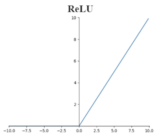 The application of activation functions increases the nonlinearity of neural network models. The commonly used activation functions are Rectified Linear Unit (ReLU) [11], Randomized ReLU [45], Exponential Linear Unit (ELU) [46], and so on. ReLU is one of the most remarkable non-saturation activation functions, as shown in Figure 1, and its mathematical expression is as follows: