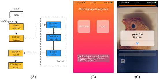 Illustration of chick day-age recognition application. (A) demonstrates the technical process of the application; (B) is a screenshot of the application; (C) is a screenshot of the application in use.
