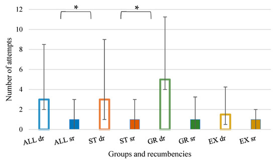 Figure 1. Number of attempts needed to achieve a correct endotracheal intubation. Groups are identified by colours: blue—all; orange—undergraduates (ST); green—graduates (GR); yellow—experts (EX). Recumbencies are identified by bar fill: dorsal recumbency (dr)—no fill; sternal recumbency (sr)—full fill. * Statistically significant difference between recumbencies.