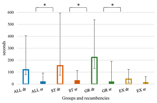 Figure 2. Time (seconds) needed to achieve a correct endotracheal intubation. Groups are identified by colours: blue—all; orange—undergraduates (ST); green—graduates (GR); yellow—experts (EX). Recumbencies are identified by bar fill: dorsal recumbency (dr)—no fill; sternal recumbency (sr)—full fill. * Statistically significant difference between recumbencies.