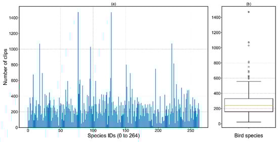 A total of 72,172 bird call samples, including 264 bird species (Figure 1), were acquired from Xeno−Canto []. These audio samples are in 16−bit wav format with a 16 kHz sampling rate. There are 273 samples of each species on average, which might be helpful for model training.