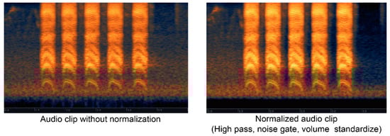 The original audio data were full of invalid signals concentrated in low frequencies; potential interference of model training. Thus, each sample was assigned a generalized high−pass filter to remove the low frequencies, especially between 0~150 Hz. As the signal−to−noise ratio (SNR) plays a crucial role in quantifying the quality of audio samples [], a gate function with a specified threshold was implemented to eliminate the redundant background noise (Figure 2). The way birds make a call is the primary reference for identifying species. Therefore, a syllable is a key to identifying bird species. An audio clip is considered valid if it contains at least one syllable, which conventionally lasts for about 50~500 ms. Except for the rhythmic syllable interval of birds call, all audio samples were trimmed compactly to remove the sound of silence. To reduce the risk of being biased to an audio clip in a certain length and amplitude, we normalized all of the audio samples into standard amplitude clips with 10 s in which the peak signal is zero decibels.