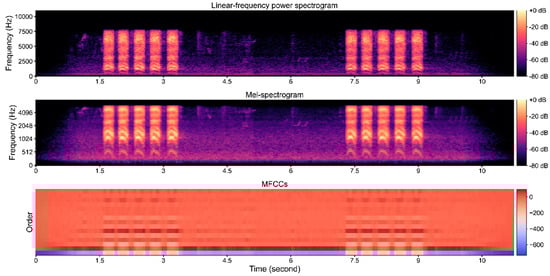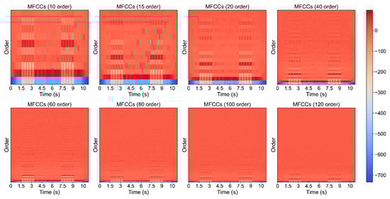 where denotes the Mel frequency and the is the original frequency. MFCCs were calculated on the decibel−scaled Mel−spectrogram by assigning discrete cosine transform (DCT) to Mel−spectrogram. The orders of MFCCs were set to 20, which was empirically proved to be efficient (see Section 3.3.1.) for demonstrating the distribution of features. Finally, we concatenated Mel−spectrogram and MFCCs to form a matrix of 148 × 801.