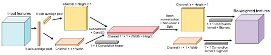 The coordinate attention (CA) [] module (Figure 4) was implemented on input features seeking more channel−wise and spatial contextual information in both horizontal and vertical directions, respectively. As shown in Figure 4, the input features were pooled along the horizontal (Y−axis) and vertical (X−axis) directions to obtain two two−dimensional feature maps, respectively. These feature maps were concatenated and computed by 1 × 1 convolution for more channel−wise interactions. Subsequently, the concatenated feature map was normalized, followed by activation, and then spatial−wise split into fh, fw, respectively. Another corresponding pair of 1 × 1 convolution kernel whose number of channels is equal to the original input features was implemented on fh, fw yielding the final pair of attention weights for horizontal and vertical directions, respectively. Note that sigmoid functions were activated on 1 × 1 convolution for non−linear representation. The re-weight process can be formulated as: