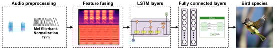 Bird calls are proved to possess temporal characteristics. Different bird species have their own corresponding rhythmic features. The recurrent neural network was verified to be remarkable in dealing with time−series issues. However, as the time span expanded, the plain RNN failed to learn the long−term context, which is crucial for predicting the status of the next timing. For large training processes, the plain RNN is unable to resolve the problem of gradient disappearance and explosion. Long short−term memory (LSTM) [] is an advanced variant of RNN which integrates specified gates to retrieve the long or short−term context from the input. Therefore, LSTM was selected as our baseline network (Figure 5). Instead of directly extracting features from spectrogram and MFCCs, LSTM leverages the temporal context to enhance identification performance.