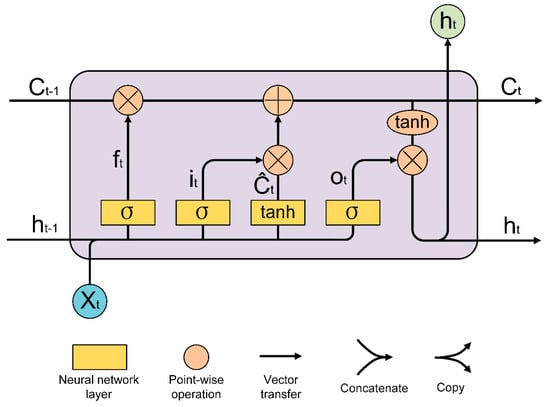 A single LSTM module consists of a series of neural networks, point−wise operation, vector transfer, concatenate and copy operation. As shown in Figure 6, the first sigmoid function is regarded as forget gate, which filters the combination of and to retain the useful features as well as discharging deprecated features from the previous cell state . The second sigmoid function and the first function act as input gates collecting the required features that input has brought about at time t. Cell state represents the cell state at time t, which is the addition of multiplication of the previous cell state and the factorized features from the input . Depending on the acquired cell state , the hidden state at time t can be calculated by multiplying the third sigmoid function output of the combination of , and the second tanh function output of cell state . All of the processes of a single LSTM module can be formulated as: