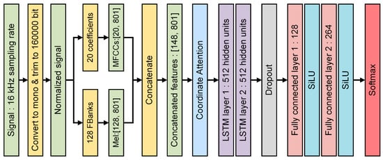 The CA [] module was implemented on the input feature that was fused before because the merged input feature (Mel−spectrogram and MFCCs) was already full of semantic elements. It was needless to generate additional convolution kernels or pooling layers to fine−tune it as we want the LSTM module to extract more fine−grained temporal features. Moreover, the CA module is able to parallelly capture both the channel−wise and positional context, which is ignored in the convolutional block attention module (CBAM) []. In terms of LSTM structure, considering the 264 involved bird species, we empirically set the number of hidden units to 512 to process the input feature (148 × 801). We noticed that the 512 is probably the best set of the hidden units, which is better than the set of 256 and the set of 1024. We also found an issue out of expectation that the bidirectional LSTM [] performed worse, which might be caused by overfitting. The activation function is the critical component in the model training process. We chose SiLU as the activation function, which is able to smooth the gradient of neurons whose value is below zero. The derivative of layers close to the output layer becomes very small and reaches zero, resulting in the weight of the layers near the output layer updating slowly or even not updating, and thus these layers learn about nothing []. In this way, our model is able to mitigate the invalidation of neurons during the training process. We experimented with validating the CA and SiLU. It showed that the model achieved the highest performance by leveraging both CA and SiLU. Empirically, the deep learning model is sensitive to hyper−parameters. In order to avoid overfitting, the learning rate was set to as low as possible. We set the hyper−parameter ‘epoch’ to 70 to achieve ideal performance.