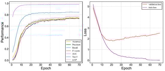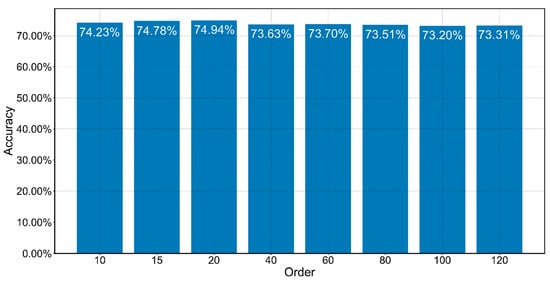 The proposed model was trained for 70 epochs (Figure 8). According to the conclusion of the prior research on identification based on acoustic features [], the input acoustic feature can bring crucial effects on the accuracy of the model. Therefore, we firstly conducted a feature validation experiment in which multiple types of input features were assigned to our proposed method to generate the corresponding results listed in Table 3. Apart from that, normalization is a function that compares the features of different dimensions numerically, which is conducive to improving the model’s accuracy. As a result, the search process of the optimal gradient becomes smoother, which is hopeful for model training to converge to an ideal solution. For the feature type of Mel−spectrogram and MFCCs, we assigned normalization to both of them to measure the potential improvement that normalization exerted. The normalization function is formulated as: