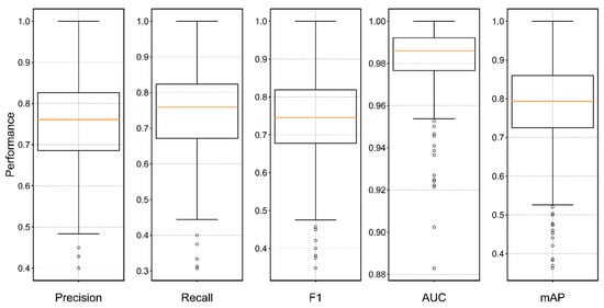 Boxplots of the proposed model. Each metric includes 264 results. Statistics: Premax = 100.00%, Premin = 40.02%, Prestd = 0.1170, Preavg = 74.51%; Recmax = 100.00%, Recmin = 30.76%, Recstd = 0.1268, Recavg = 73.51%; F1max =100.00%, F1min = 34.78%, F1std = 0.1090, F1avg = 73.45%; AUCmax = 100.00%, AUCmin = 88.29%, AUCstd = 0.0163, AUCavg = 98.21%; mAPmax = 100.00%, mAPmin = 36.25%, mAPstd = 0.1195, mAPavg = 77.43%.