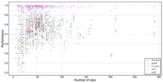 The performance of the deep learning model is conventionally dominated by its quantity of training datasets []. We illustrated a distribution of performance scores of different metrics considering the amount of validation bird calls dataset (Figure 10). Overfitting is the main issue that greatly limits the overall performance of the model. Therefore, we enlarged our training dataset as much as possible to mitigate that issue. Our dataset contains 72,172 bird call clips (126 gigabytes), which is far more than prior studies [,]. A large dataset ensures the baseline performance of the model. Moreover, the dropout rate was empirically experimented with many times to find the best set of it that ultimately minimizes the overfitting problem. We explored the importance of multiple types of input features to validate MFCCs and Mel−spectrogram. The experiment results presented that MFCCs played an important role in boosting the overall performance of the model, and thus, we discussed the effect of MFCCs orders on the model.