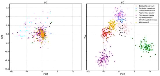 To describe the visual traits of the input feature and output feature, principal component analysis (PCA) [] was implemented to reduce the dimension of these two feature types, respectively. The parameter component was set to 2, which is essential for 2−D visualization. The input feature originated from both Mel−spectrogram and MFCCs in a matrix of 148 × 801, while the output feature was generated in the vector of 264 from the process stack of coordinate attention, LSTM layers, and fully connected layers. We randomly selected 600 samples out of eight bird species. From the view of the PCA result (Figure 13), the samples of input features were scattered densely. In contrast, the samples of output features were generally divided into two clusters, which implicitly illustrated the good classification performance of the model.