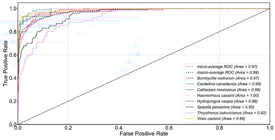 In order to present a diagnostic performance of the proposed method, the receiver operating characteristic (ROC) [] curve was introduced. Six hundred test samples out of eight species were tested for rendering a single−class binary classification ROC curve (Figure 14). The curve was generated by plotting the true positive rate (TPR) against the false positive rate (FPR) at various threshold settings. The proposed model maintained a good diagnostic ability and achieved 0.97, and 0.98 micro and macro averaged AUC.