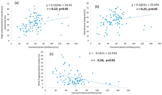 Associations between sperm concentration and (a) membrane integrity; (b) mitochondrial membrane potential; and (c) DNA fragmentation index for young bull ejaculates processed by single-layer centrifugation.