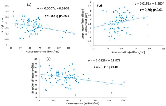 Association between sperm concentration and kinematics for young bull ejaculates processed by single-layer centrifugation: (a) straightness; (b) amplitude of lateral head displacement; (c) beat cross frequency.