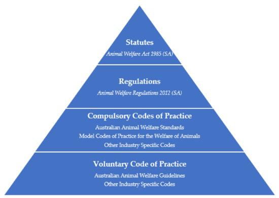 Hierarchy of state and territory legislation in relation to animal welfare protection. Note that the legislation listed use South Australia (SA) as an example and do not represent a comprehensive list.