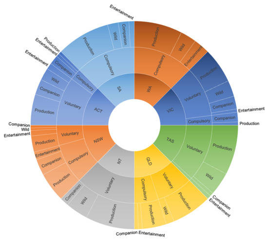 Using the search strategies stemming from the eight enabling acts, this study identified 18 regulations (Table 2), 79 compulsory codes (see Appendix A) and 104 voluntary codes (see Appendix B) in force. Each piece of subordinate legislation was included for review and allocated into the following utility categories: companion animals, production animals, wild/exotic animals, or animals used in entertainment. The areas of welfare protection discussed in the results are not intended to be an exhaustive list of all areas relating to each area of animal use, as it is recognized that some areas would be regulated under different statutes. However, these are the areas that each Australian jurisdiction has chosen to regulate under the animal welfare legislative framework.