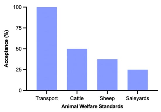 Acceptance rates of the animal welfare standards [20] currently available across the Australian jurisdictions. Acceptance is measured by their incorporation under any legislation (not exclusive to animal welfare legislation), in primary or secondary form. Transport standards have been accepted by all jurisdictions (100%); cattle standards accepted by NSW, QLD, SA, WA (50%); sheep standards accepted by NSW, QLD, SA (37.5%); saleyard and depot standards accepted by QLD, WA (25%).