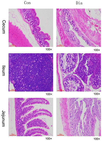 The staining of intestinal tissues showed a coagulative necrosis of the jejunum mucosa in the Dia group and neat cells in the Con group. The number of lymphocytes in ileal lymph tissue in the Dia group decreased, and the number of lymphocytes in the Con group was normal. We observed a full-thickness coagulative necrosis of the cecum wall. On the contrary, the small intestine of the Con group was intact without pathological changes (Figure 1).
