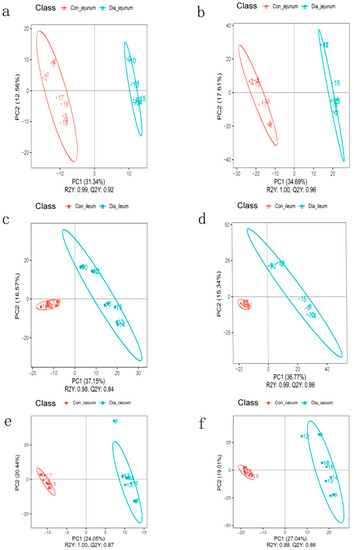 Partial least squares discriminant analysis (PLS−DA) was used to evaluate the sample differences between groups. (a,b) PLS−DA score map of jejunum in normal and diarrhea group under positive and negative ion modes; (c,d) PLS−DA score map of ileum in normal and diarrhea group under positive and negative ion modes; (e,f) PLS−DA score chart in positive and negative ion modes of cecum in normal and diarrhea groups.