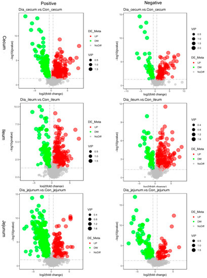 Volcano map of the difference in metabolites of Hyplus rabbits’ jejunum, ileum, and cecum tissue samples in the positive and negative ion modes. Green represents the downregulated metabolites, red represents the upregulated metabolites, respectively, different between groups, and gray represents the metabolites without significant changes. The abscissa indicated the change of differential metabolites between the Dia group and the Con group. The ordinate represents the significant level of differential metabolites between groups. Note: positive: cationic mode; negative: anion mode.