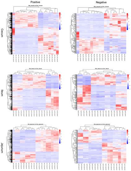 Cluster heat maps showing the distributions of different metabolites in the Dia and Con groups were similar, with trees indicating that the Dia and Con groups of rabbits’ ileum and cecum jejunum tissue samples could be separated (Figure 4).