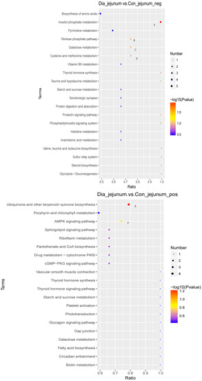 The contents of 373 different metabolites in the cecum of the Dia rabbit group were higher than those of the Con group, while the contents of 278 different metabolites in the cecum of the Dia group were lower than those of the Con group. The contents of 411 different metabolites in the ileum were higher than those in Con rabbits and 225 metabolites were lower. Finally, compared with the control group, the contents of 424 different metabolites in the Dia rabbits’ jejunum were higher, while they were lower for 258 metabolites (Figure 3).