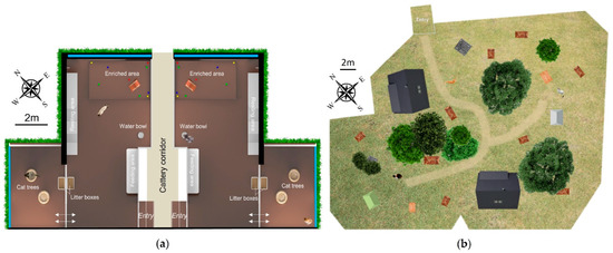 The outdoor population constituted one group of 27 cats (15 neutered females, 9 castrated males and 3 intact males) aged from 1 to approximately 12 years old, all belonging to European breeds. The cats came from different origins: 20 were previously feral and 7 were previously pet cats, before arriving at the shelter. They had been living together for at least one month prior to the beginning of the study. The individuals were housed in an outdoor enclosure with grass, shrubs and trees, of about 1145 m2 at the shelter AVA (Agir pour la Vie Animale) located in the north of France (Cuy-Saint-Fiacre, Normandie, France). Within the enclosure, cats had also access to two chalets containing shelves with cat baskets, nine kennel areas filled with clean straw, two litter areas, two drinking areas containing two stainless-steel water bowls each and two feeding areas, each containing eight doors giving access to two feeding bowls (Figure 1; figures and tables are improved and formatted versions of those used in the PhD thesis [34] during which this study was conducted). According to the population density, the outdoor cats had 42.4 m2 available per individual.