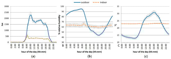 Mean daily luminosity (lux, a), ambient temperature (°C, b) and relative humidity (%, c) according to the housing condition (indoor versus outdoor). Error bars represent standard errors.