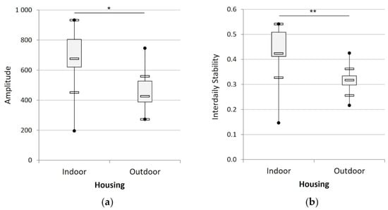 Mean amplitude (a) and interdaily stability (b) of the activity rhythm of the cats according to their housing condition (indoors (n = 15) versus outdoors (n = 8)). (*) indicates p < 0.05, (**) indicates p < 0.01.